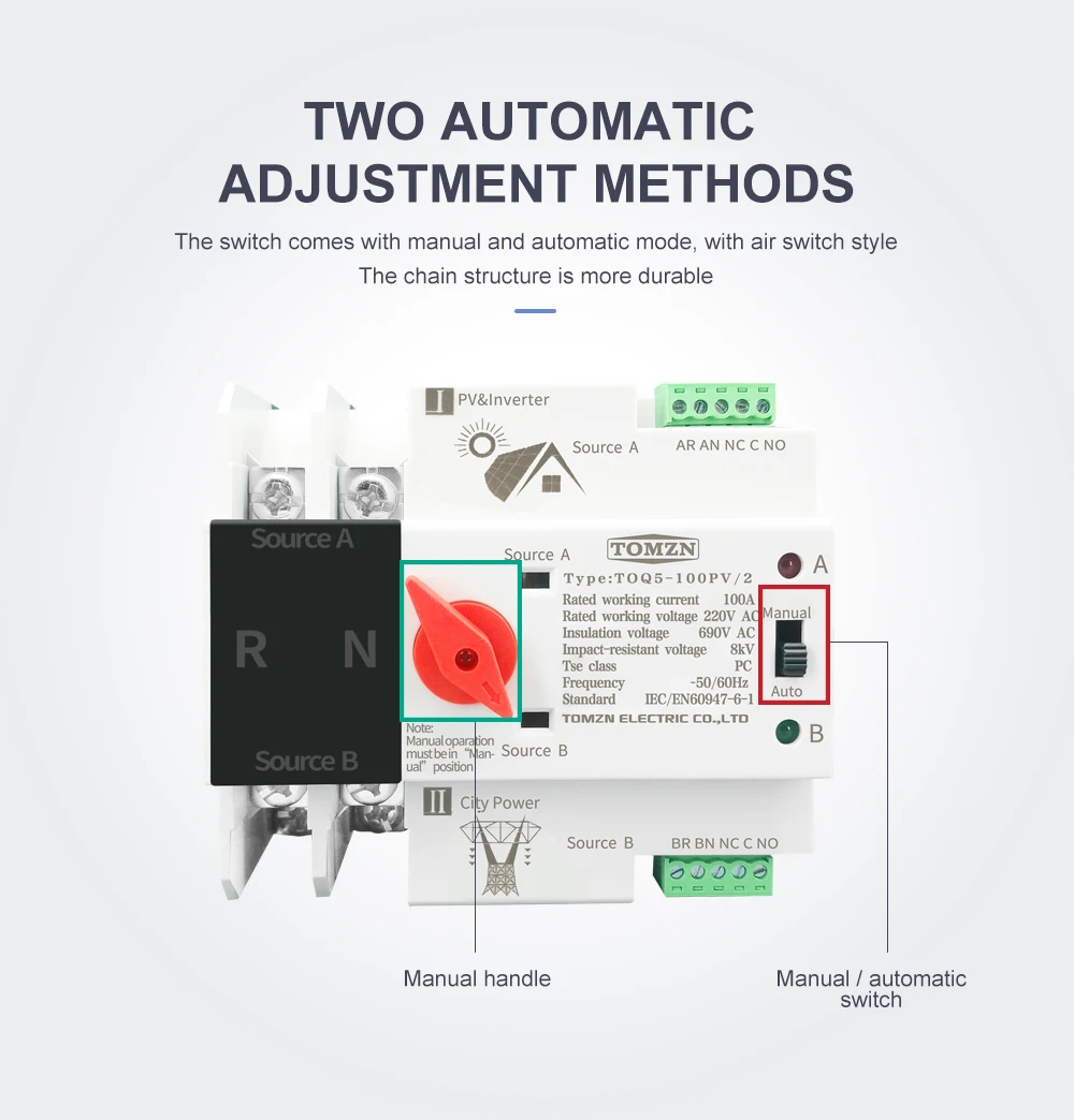 ATS tipe INVERTER/PV ini harus dihubungkan ke listrik jaringan untuk sumber daya cadangan/backup, dan inverter / sistem PV sebagai daya utama.