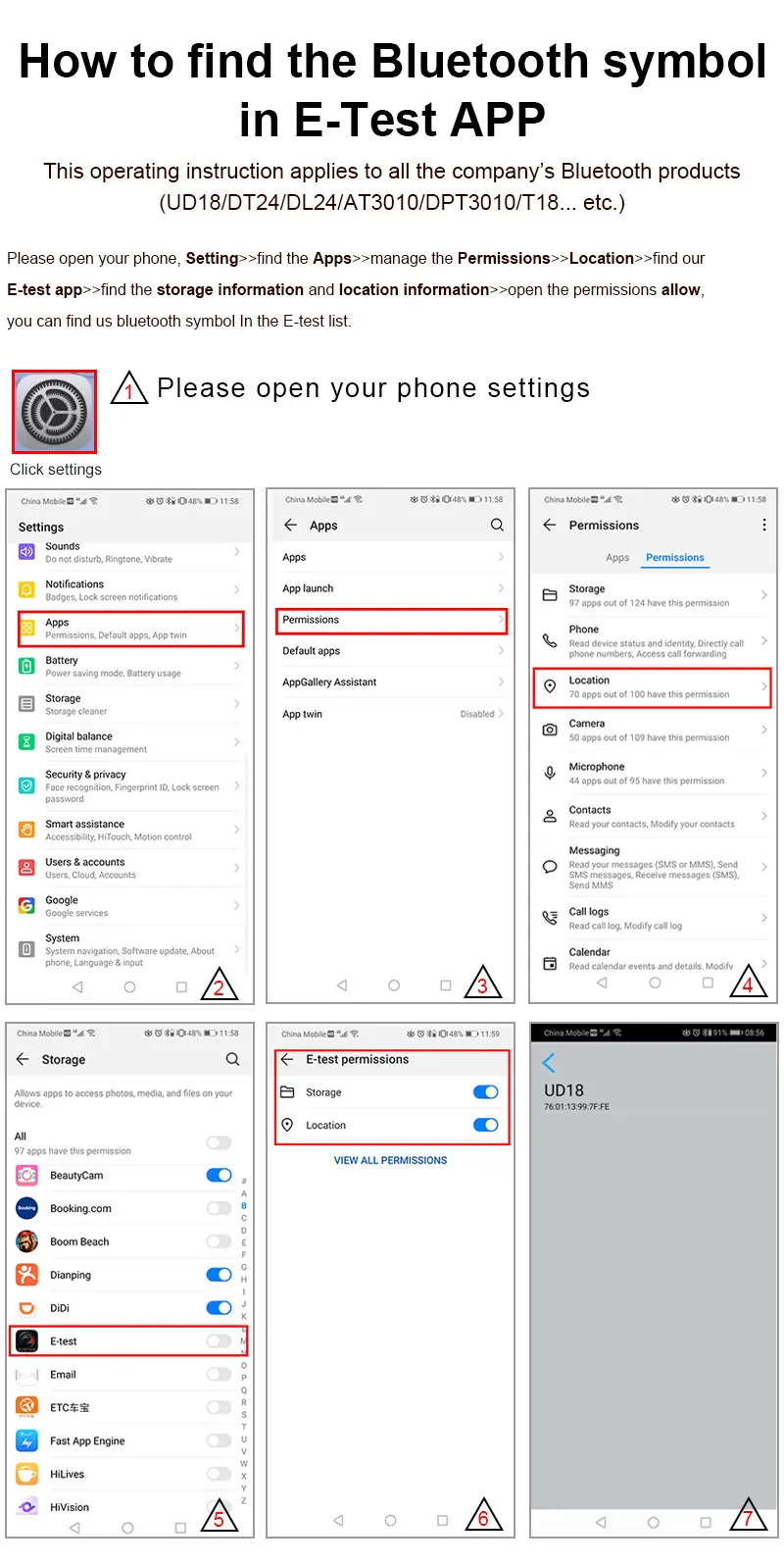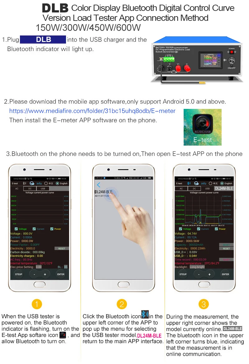 Scan the QR code on the back of the host to download the corresponding APP software or Android APP: search E-test at Google play to down load . After the installation is complete, open the software and click the Bluetooth icon to enter the direct selection of DL24-BLE to successfully use it online. (No need for Bluetooth pairing, the software Bluetooth icon directly selects DL24. can)