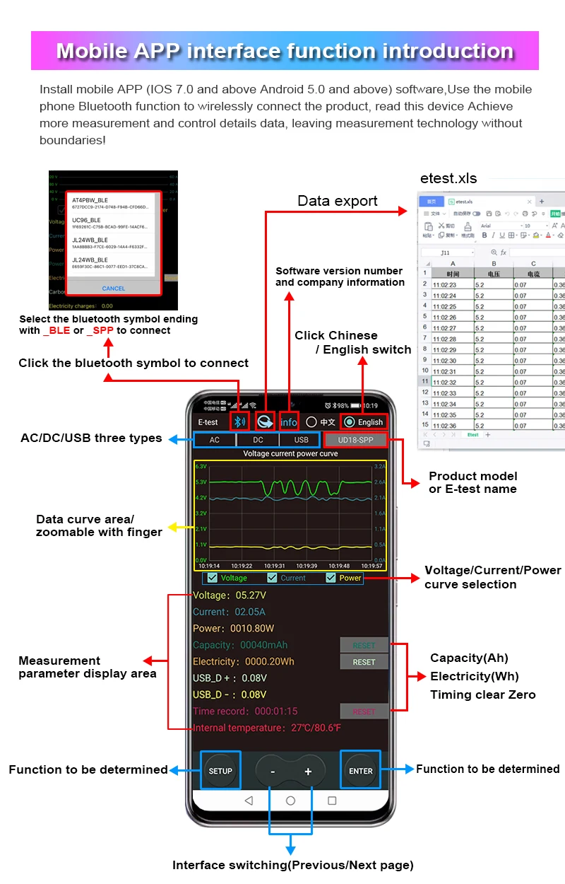 Please search for E_test in the application store to download and install, then click the Bluetooth APP icon to open the software, and then click the Bluetooth icon above the software to enter the selection DL24-BLE to connect, you can achieve mobile phone remote wireless remote control settings and Measurement function, the discharge status can be viewed at any time on the mobile phone, various data cleaning is visible, the voltage and current power curve of the discharge, etc.