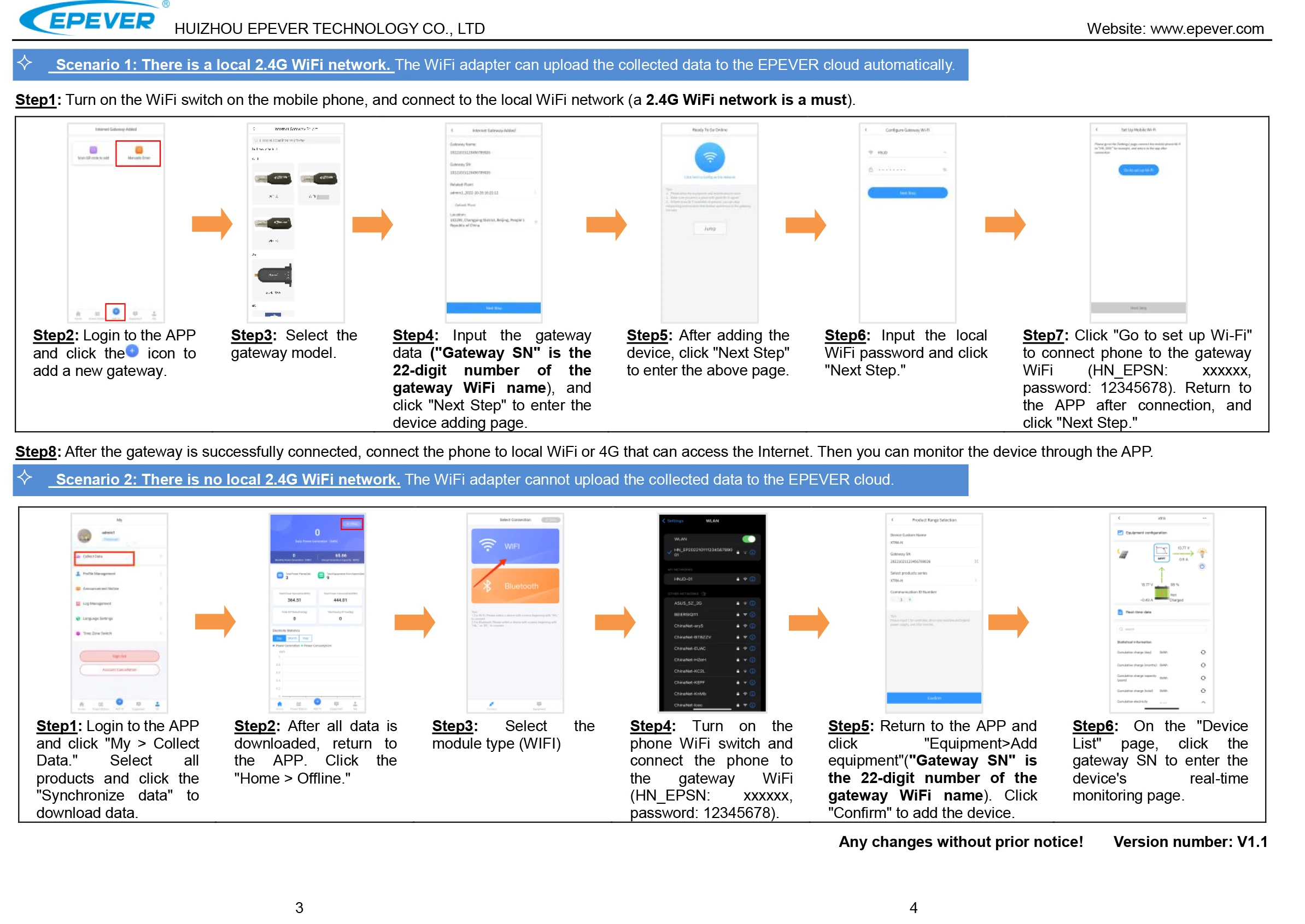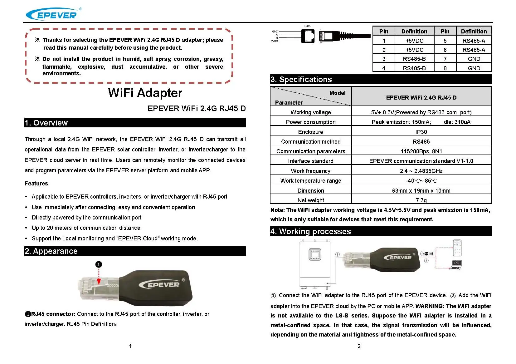The EPEVER WiFi 2.4G RJ45 D WiFi adapter is mainly used for real-time transmission of various power generation data from EPEVER controllers, inverters, hybrid inverter chargers, etc. to the EPEVER cloud server. It supports wireless monitoring and parameter setting of on-site devices via cloud servers, mobile apps, or large screens.