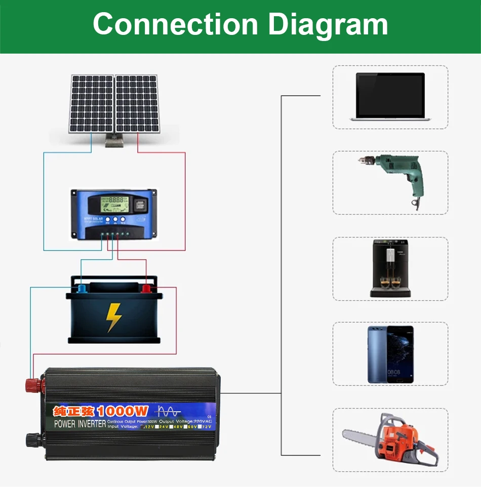 Inverter 2000W dapat membawa peralatan resistif biasa dalam 1000W, 1600W dapat membawa peralatan listrik 800W, seperti: komputer, TV, kipas angin, lampu listrik, ini adalah peralatan resistif yang dapat dibawa.