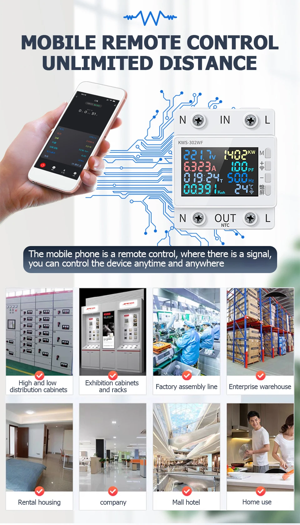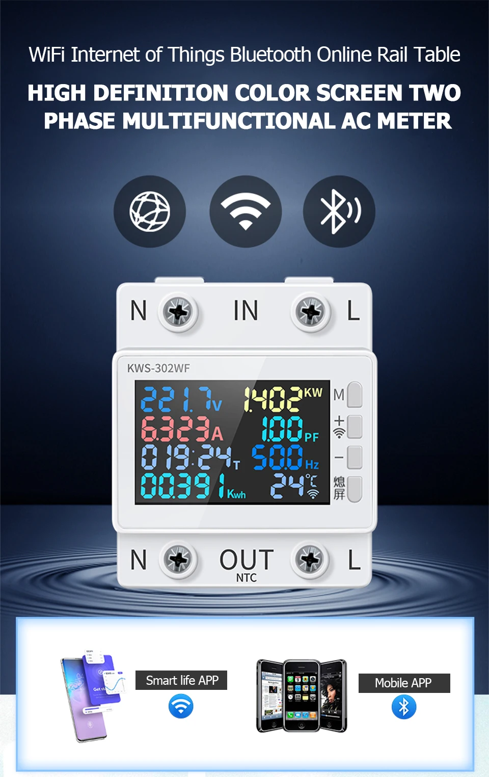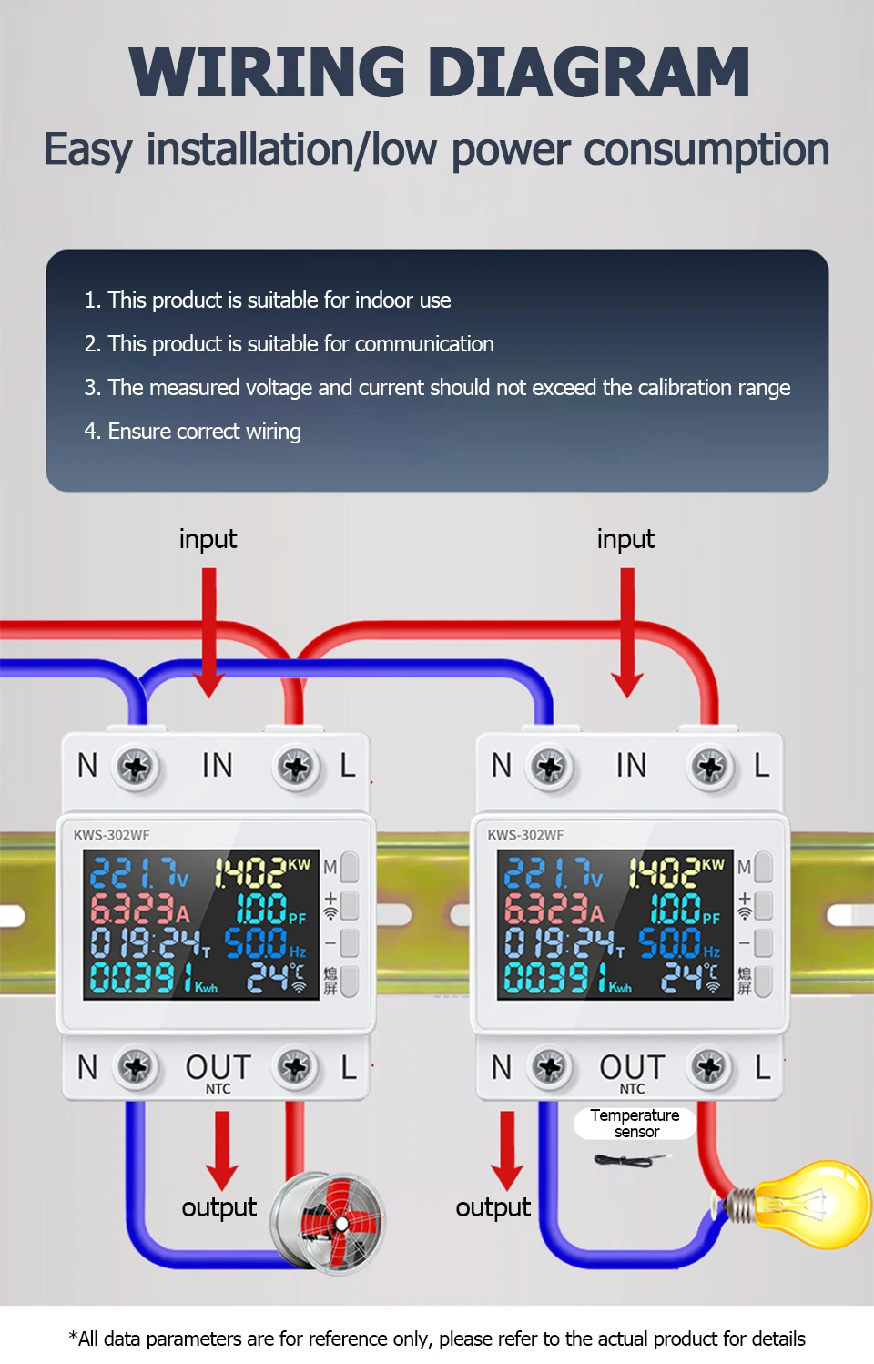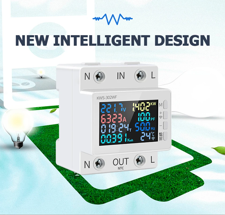 This 2P energy meter has a higher definition interface, more accurate data display, more convenient operation, safer electricity use. Voltage, current, power, timing, electric energy, temperature, frequency and power factor 8in1 design, convenient for users to understand the use of electric energy, realize the visualization of electricity consumption. Standard guide rail installation, suitable for apartments, companies, shopping malls, hotels, family homes, and so on.