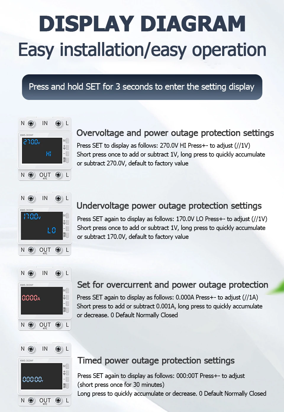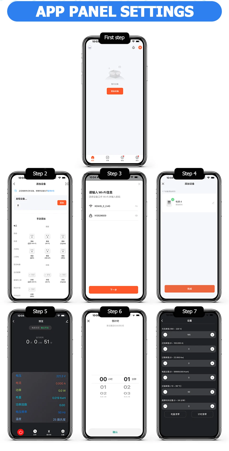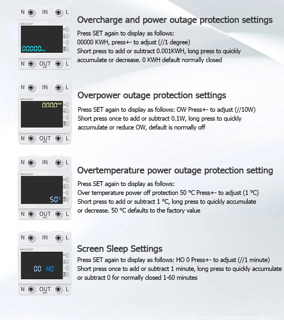 ▶ Support over-voltage, under-voltage, over-current, over-power, over-temperature, timer power failure protections setting, and screen hibernation setting.