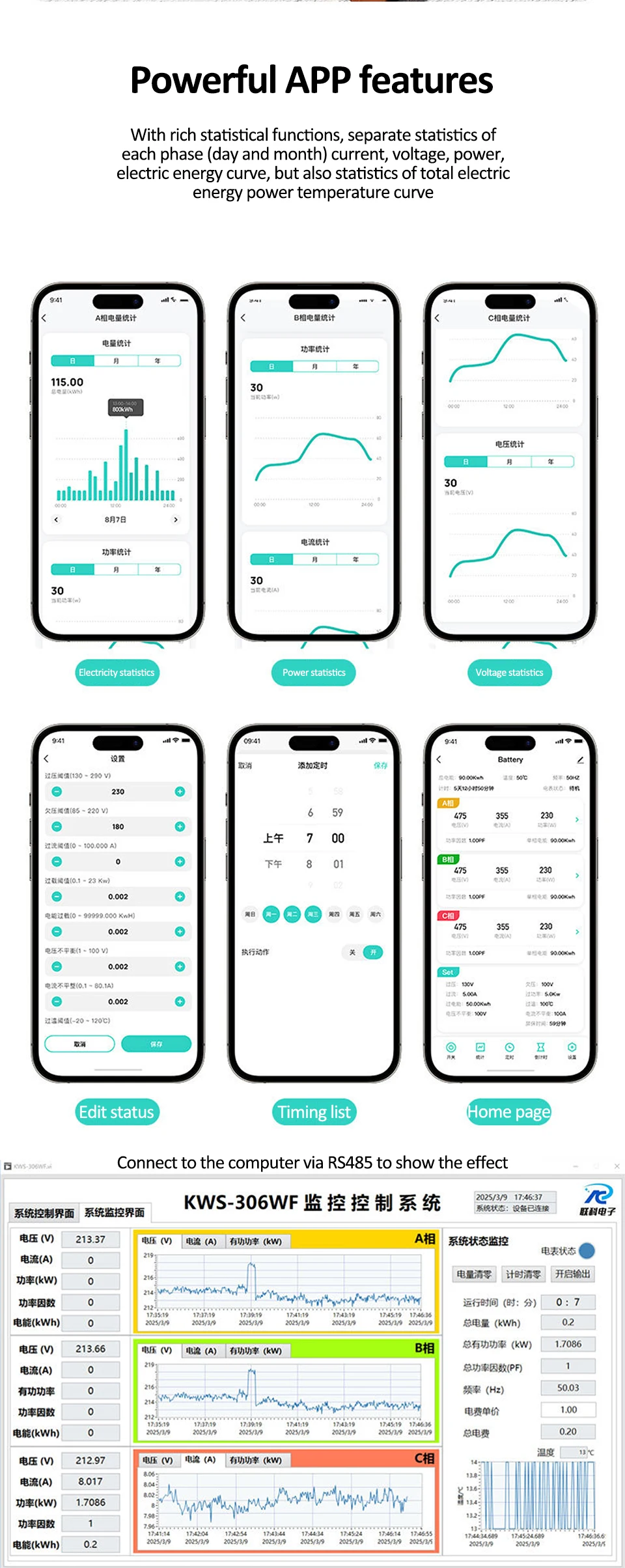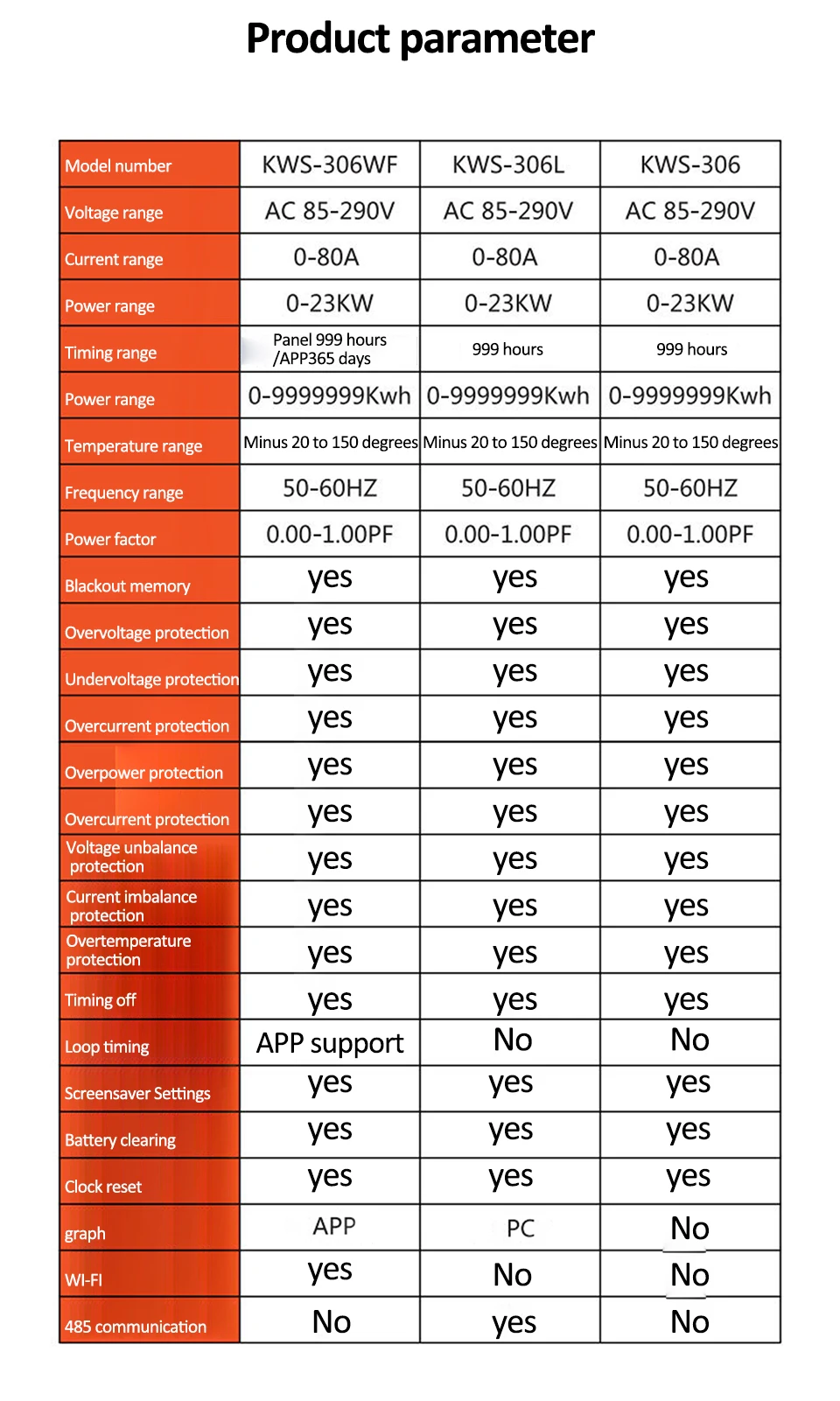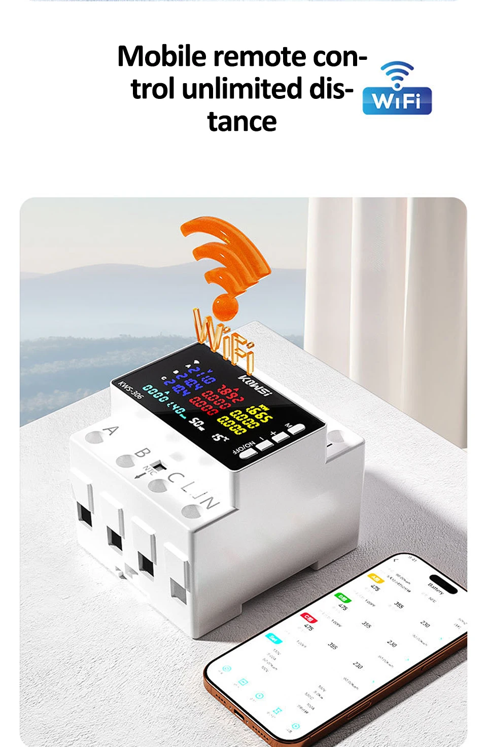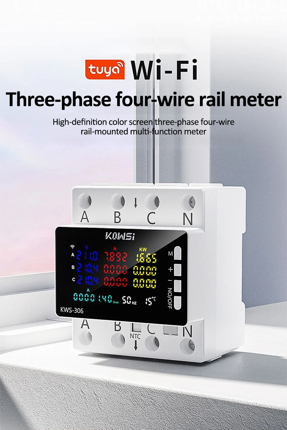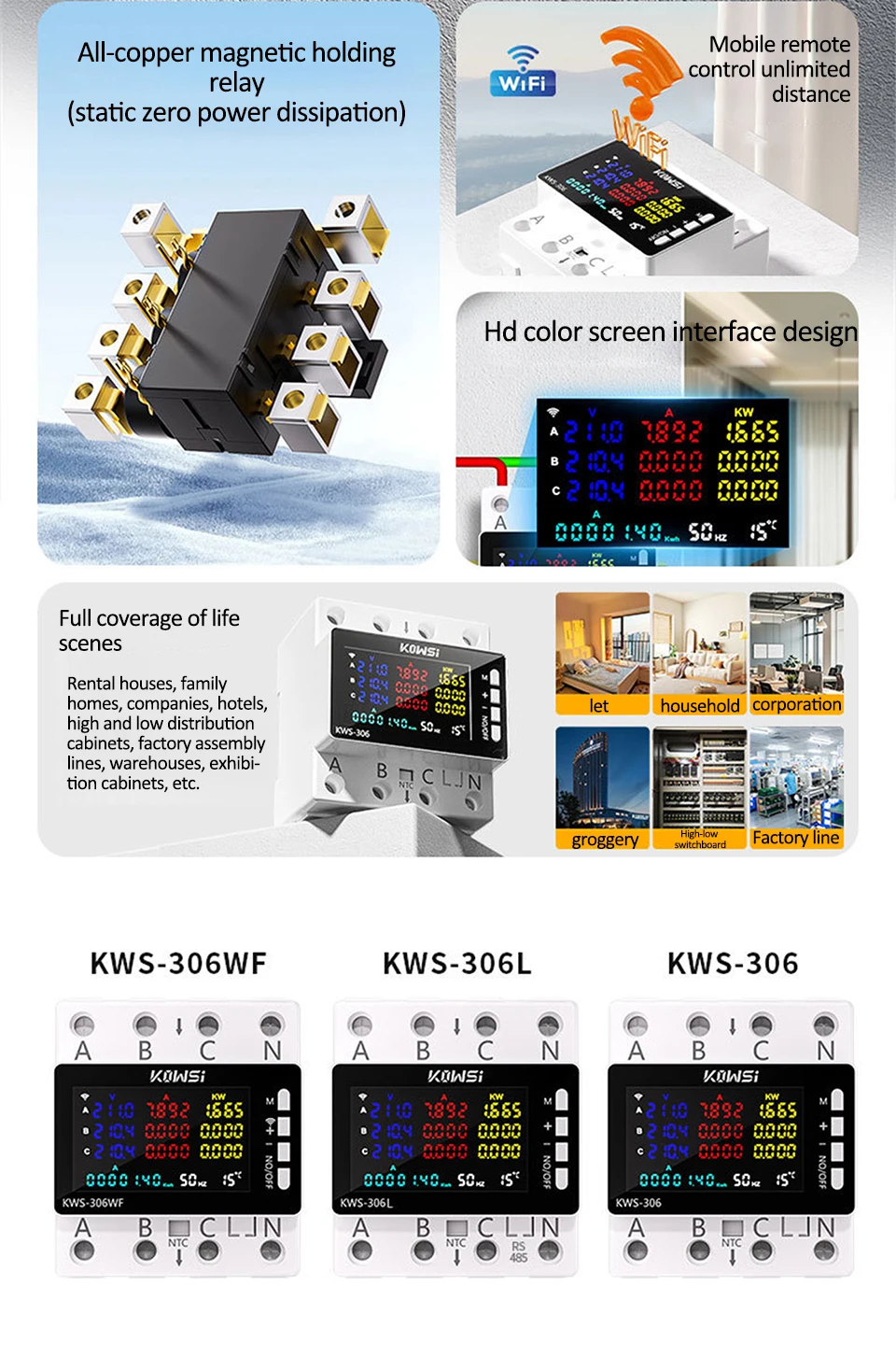 Material: High-quality static zero power magnetic holding relay materialsnDisplay Type: Digital Only with a large LCD color VA screenn Installation: Standard guide rail installation, no screws required, buckle fixationnVoltage Range: AC 85-290VnCurrent Range: 0-80AnPower Range: 0-23KWnnn|A B C Phase Color|Kws 306l|Kws 306|nn**Advanced Features and Precision Measurement**nThe KWS-306 Power Meter is a state-of-the-art device designed for precise energy monitoring in a variety of settings. With its large LCD color VA display screen, users can easily track energy consumption, voltage, amps, watts, and kWh in real-time. The digital only display ensures clear and accurate readings, making it an ideal tool for both professional and personal use. The static zero power magnetic holding relay materials used in its construction not only enhance reliability but also contribute to its low power consumption, ensuring safety and efficiency in power applications.nn**Ease of Use and Installation**nThe KWS-306 Power Meter is not only a reliable tool but also a user-friendly one. Its standard guide rail installation eliminates the need for screws, making it effortless to install. The buckle fixation system ensures a secure and stable mounting, providing peace of mind for users. This feature is particularly beneficial for rental housing, household use, companies, hotels, and various industrial environments where quick installation and maintenance are crucial.nn**Safety and Protection**nSafety is paramount in any electrical setup, and the KWS-306 Power Meter does not disappoint. It comes equipped with a range of protective features, including overvoltage, undervoltage, overcurrent, overpower, and voltage imbalance protection. These safeguards ensure that the device operates within safe parameters, preventing damage and downtime. Additionally, the overtemperature protection and timed shutdown functions add another layer of safety, making it a reliable companion for any electrical setup.