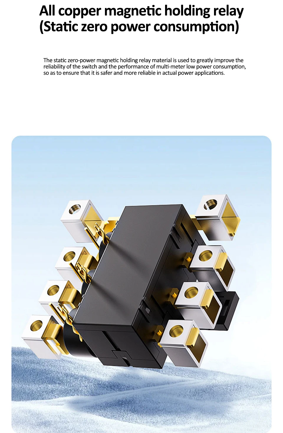 ▶The use of static zero power magnetic holding relay materials significantly improves switch reliability and multi meter low power consumption performance, ensuring greater safety and reliability in practical power applications.