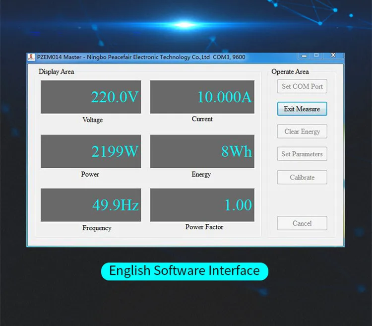 2. the software is new, we have English software as same as the PZEM-014,016, The communication protocol change to be Modbus–RTU, the display interface is changed. now it can test Voltage ,Current, Power, Power factor, Frequency and Energy 6 parameters.