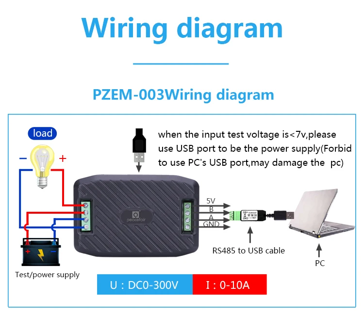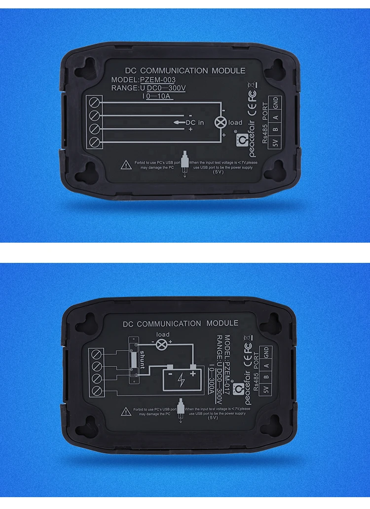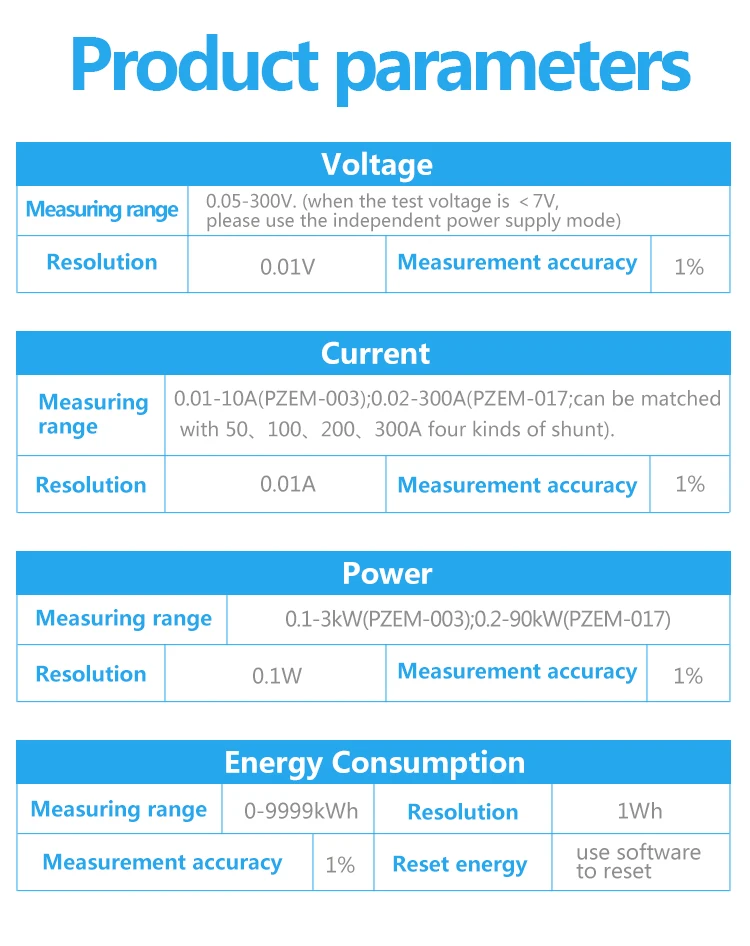2.1 Measuring range:0.01-10A(PZEM-003);0.02-300A(PZEM-017;can be matched with 50、100、200、300A four kinds of shunt).