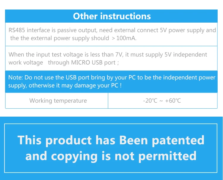 1 RS485 interface is passive output, need external connect 5V power supply and the the external power supply should >100mA.