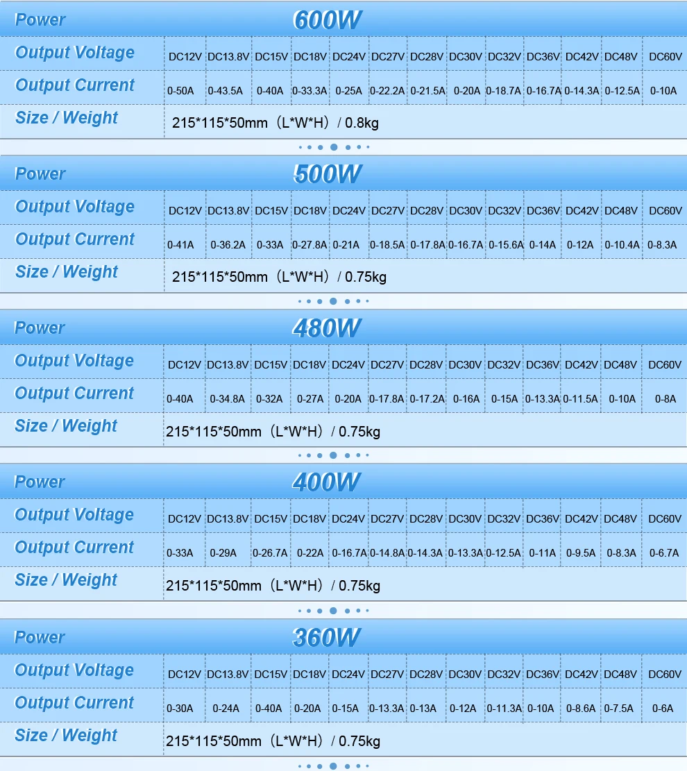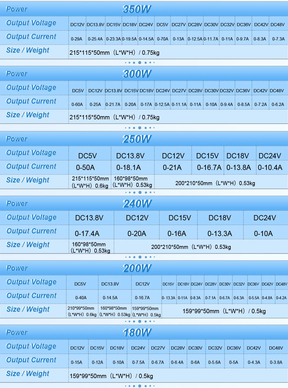 ·For Halogen lamps, Stepper motors, Brushless motors: 2 times the used power = the rated power of the SMPS.