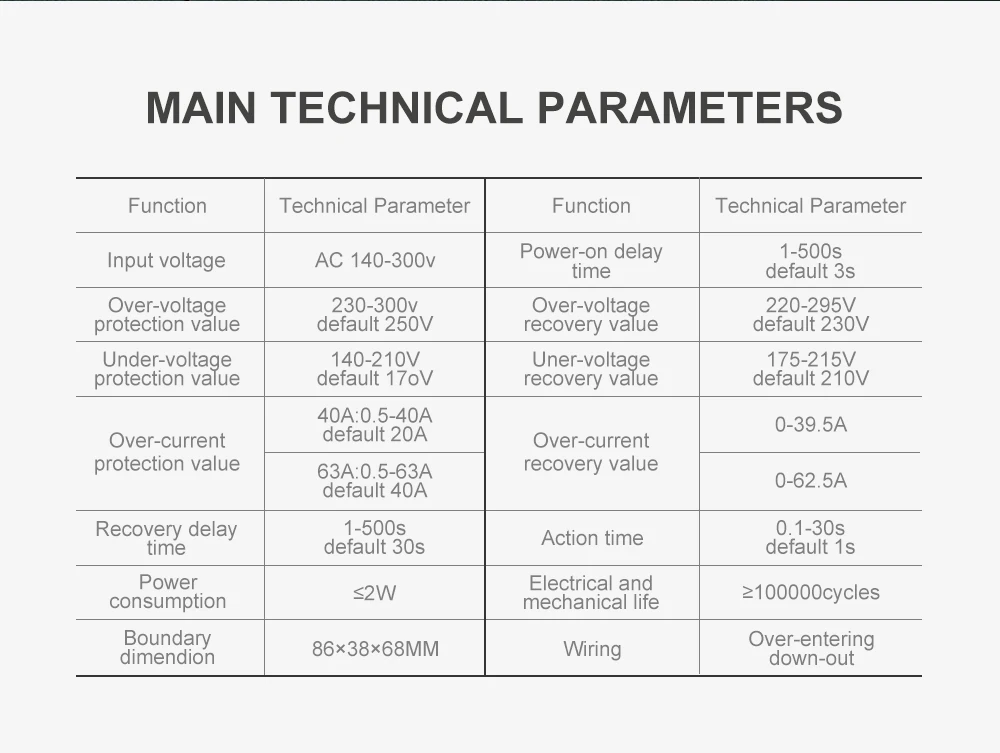 6.Over-current adjustment range:1-40A (default:20A) 1-63A (default:40A)