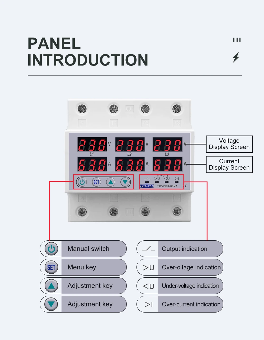 Three phase Voltage Current Relay Protector 63A 60A 100A 220V 3P+N Over Under Voltage Relay Current limiter adjustable